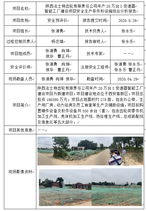 2020.08.28陜西法士特齒輪有限責(zé)任公司年產(chǎn)20萬臺(tái)S變速器智能工廠建設(shè)項(xiàng)目安全生產(chǎn)條件和設(shè)施綜合分析報(bào)告
