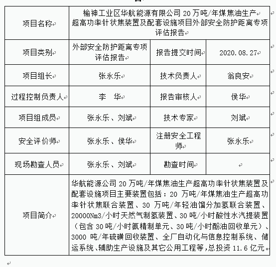 2020.08.28榆神工業(yè)區(qū)華航能源有限公司20萬(wàn)噸/年煤焦油生產(chǎn) 超高功率針狀焦裝置及配套設(shè)施項(xiàng)目外部安全防護(hù)距離專(zhuān)項(xiàng)評(píng)估報(bào)告