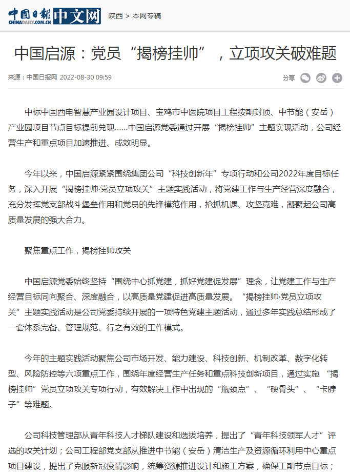 中國(guó)日?qǐng)?bào)丨中國(guó)啟源:黨員“揭榜掛帥”,立項(xiàng)攻關(guān)破難題 |
