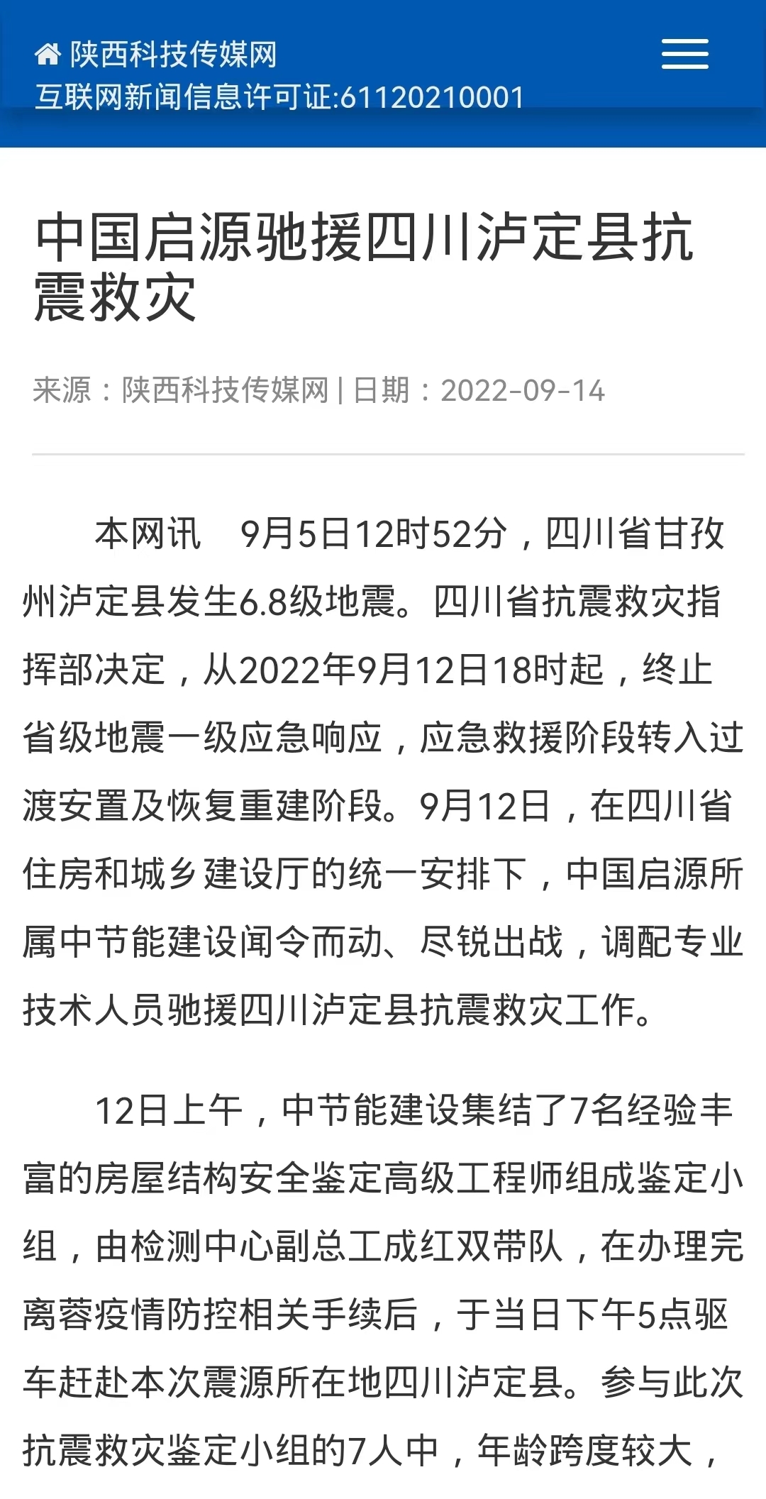 陜西科技報丨中國啟源馳援四川瀘定縣抗震救災(zāi) |