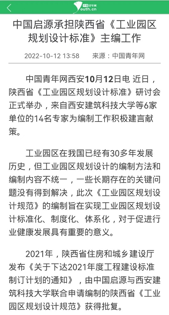 中國青年報丨中國啟源承擔陜西省《工業(yè)園區(qū)規(guī)劃設計標準》主編工作 |