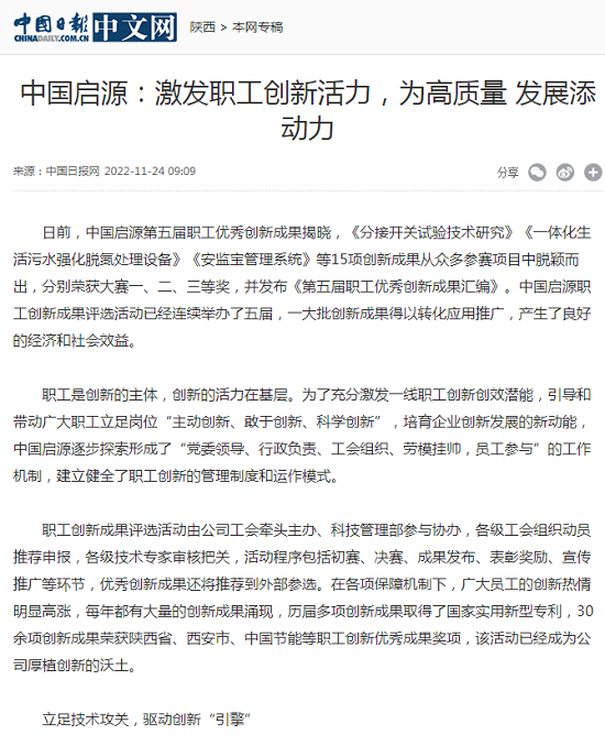 中國日?qǐng)?bào)丨中國啟源:激發(fā)職工創(chuàng)新活力,為高質(zhì)量發(fā)展添動(dòng)力 |