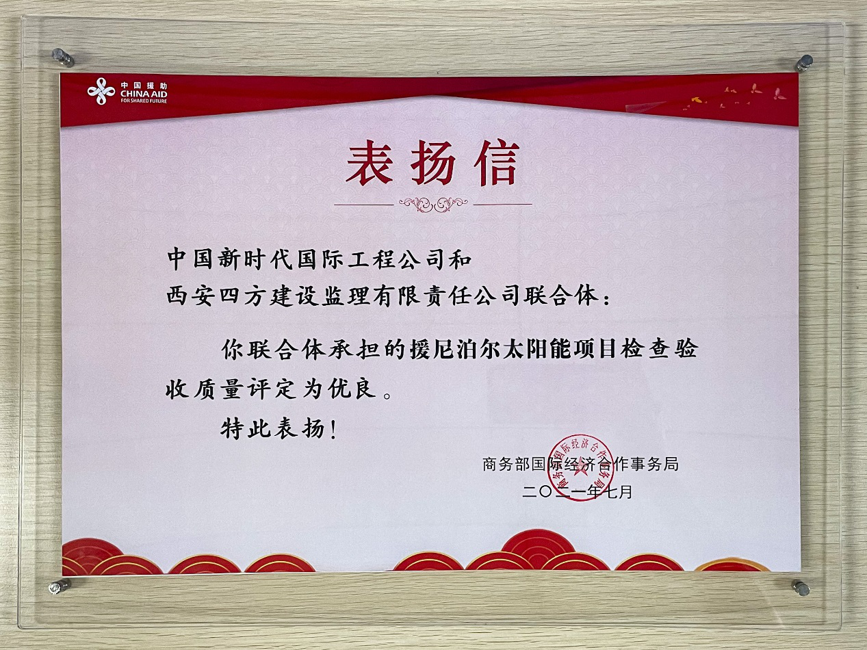 The China-aid 1.0 MWp Building Integrated?Solar Photovoltaic?(BIPV)?Project of Singha Durbar Secretariat?of?Nepal executed?by JV of China Qiyuan Engineering Corporation?(abbr. as CQEC) and Xi'an Sifang Construction Supervision Co., Ltd.?for the feasibility study, engineering design and project management has been honored as “Excellent Project”?by the Ministry of Commerce of China.